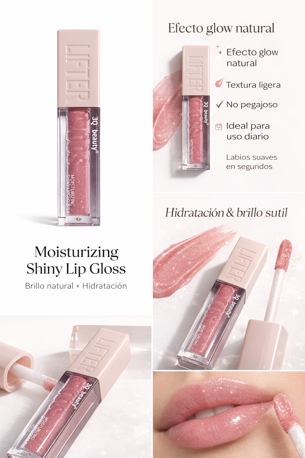 Este lip gloss aporta un efecto glow delicado que realza tus labios con un brillo sutil y elegante. Su textura ligera y no pegajosa hidrata al instante, dejando los labios suaves, luminosos y perfectos para el uso diario.